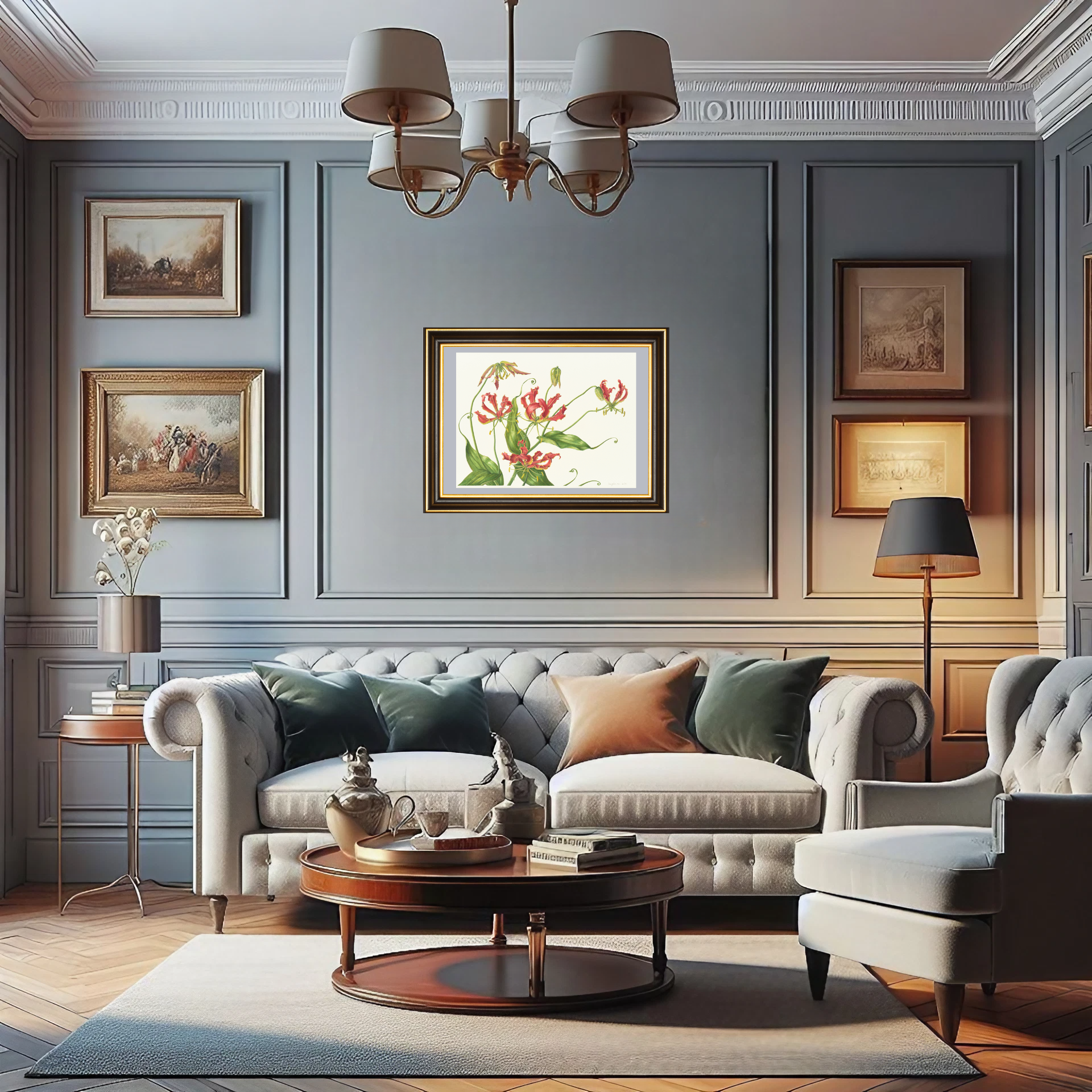 この絵を部屋に飾ることで、空間全体の雰囲気を変えることができるでしょう。グロリオサの持つ情熱的な赤が、部屋に陽気で明るい印象をもたらします。まるで太陽の光が差し込むように、ポジティブなエネルギーに満ちた空間を演出してくれるはずです。そこに暮らす人の気持ちも、自然と明るく前向きになっていくことでしょう。